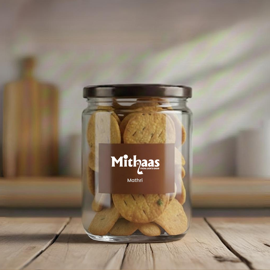 Mathri is a traditional North Indian crispy and flaky savory snack. It is made from refined flour (maida), semolina (sooji), carom seeds (ajwain), black pepper, and basic spices. The dough is kneaded stiff, shaped into small discs, and deep-fried until golden and crunchy.